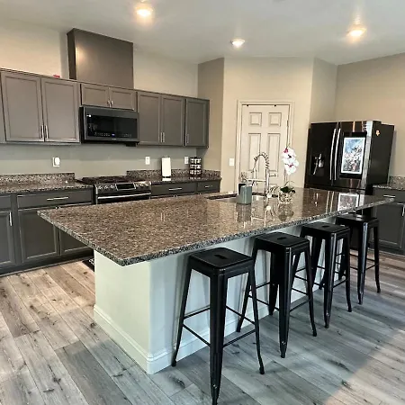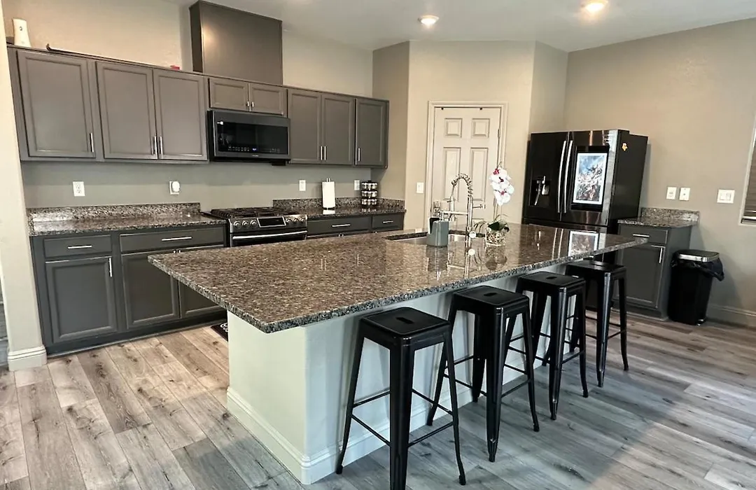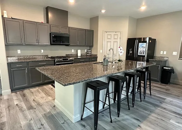 The 3-bedroom Stylish Desert Oasis Your Serene Get Away Las Vegas villa offers proximity to nearby tourist spots, such as Wet'n'Wild Las Vegas Water Park, situated nearly 25 minutes' walk away.